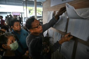 People look for their names on the voter registration sheets as polls open in Thailand’s general election at a polling station in Bangkok on February 8, 2026. (Photo by Lillian SUWANRUMPHA / AFP)